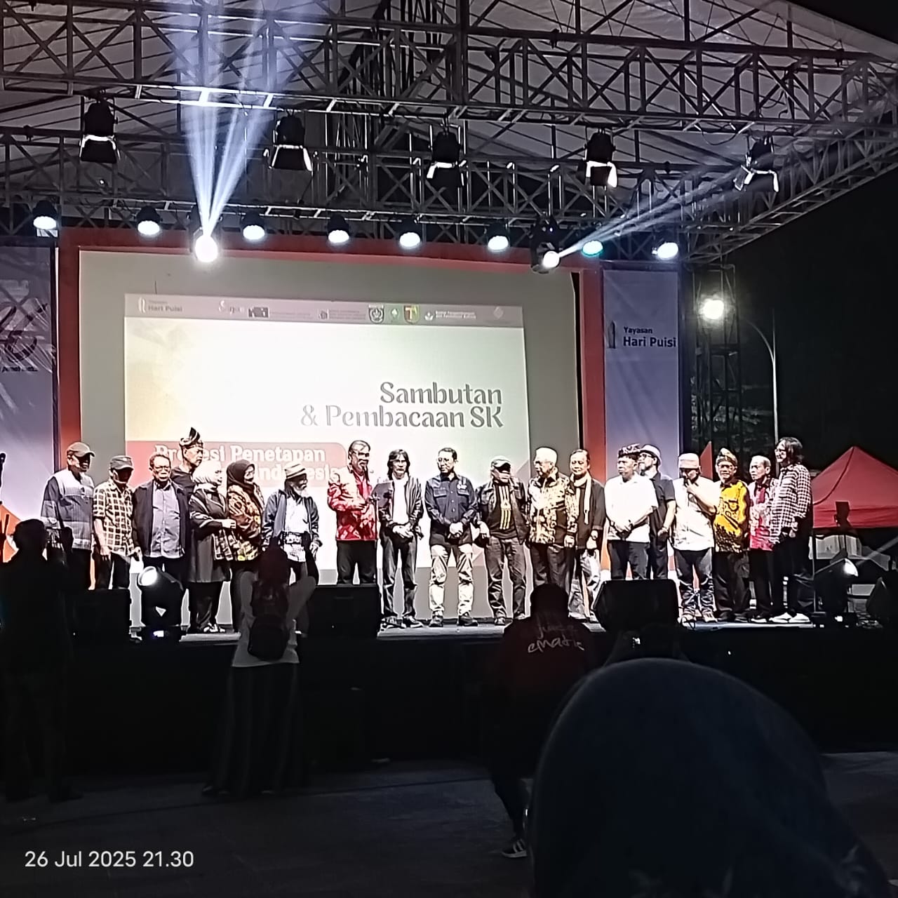 Penetapan tanggal kelahiran Chairil Anwar sebagai Hari Puisi Indonesia disampaikan sang inisiator, Rida K. Liamsi, melalui tayangan video disaksikan Menteri Kebudayaan Fadli Zon di halaman Teater Besar Taman Ismail Marzuki, Jakarta, Sabtu malam (26/7/25).
