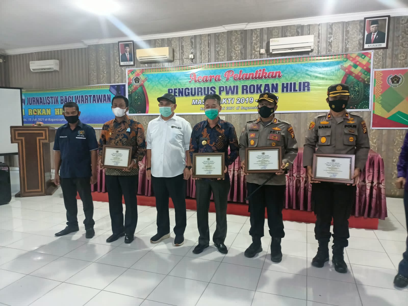 Usai pelantikan dan pengukuhan pengurus Persatuan wartawan Indonesia (PWI), selanjutnya penyerahan piagam penghargaan dari Ketua PWI Rokan Hilir kepada Kapolres Rokan Hilir yang mewakili Kasubbag Humas Polres juga Kapolsek Bangko beserta Bupati dan Wakil Bupati Rokan Hilir.