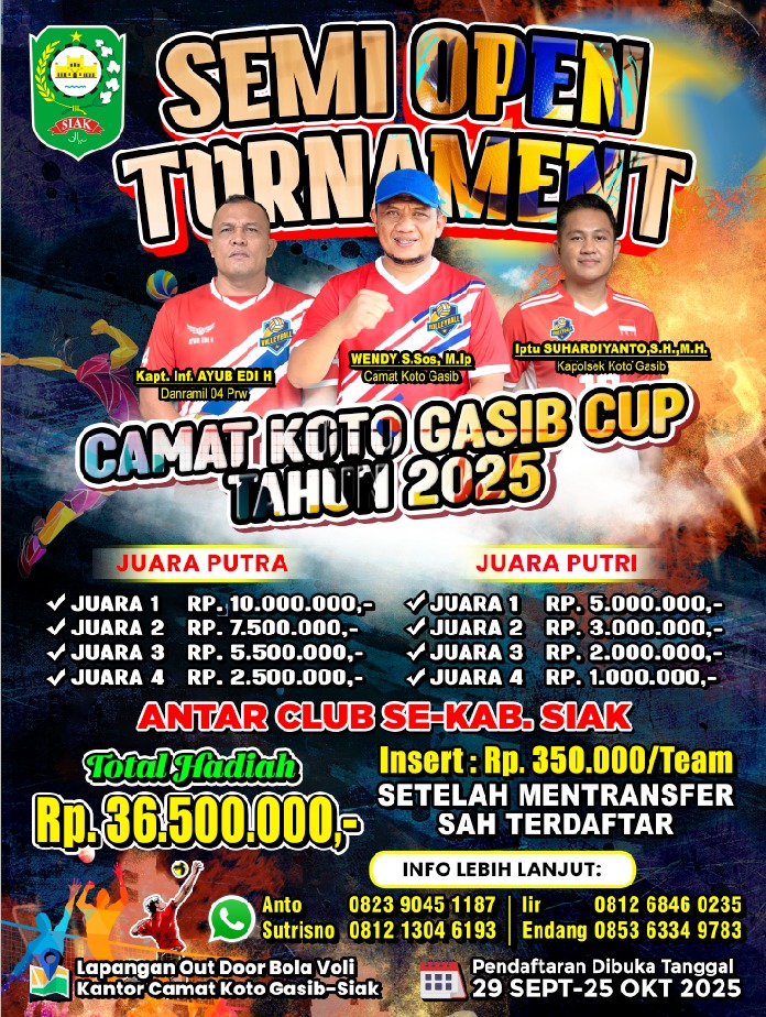 “Turnamen Camat Cup bola volly ini kita gelar dalam rangka HUT Kabupaten Siak sekaligus menyambut HUT Kecamatan Kotogasib,” ujar Camat Kamis (16/10/2025).