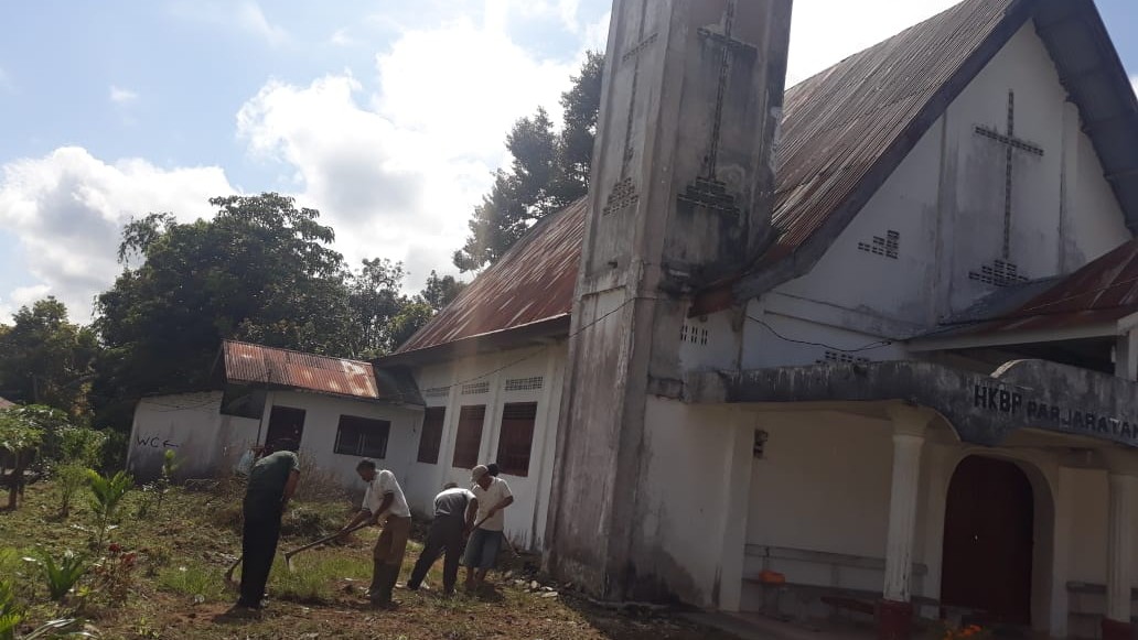 BABINSA KORAMIL 06/KERAJAAN BERSAMA JEMAAT HKBP PANJARATAN MELAKSANAKAN PEMBERSIHAN LINGKUNGAN GEREJA