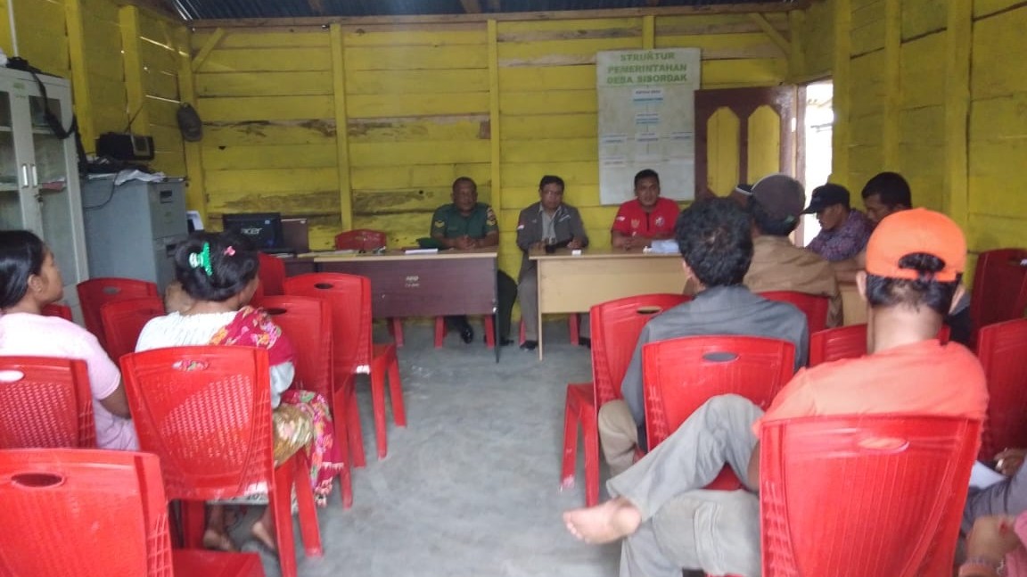 Taput, LINTAS10. COM – Babinsa Koramil 08/Parmongan, Kodim 0210/TU, Sertu Robinsar Aritonang dampingi Staf Badan Pertanahan Nasional (BPN) Kabupaten Tapanuli Utara, M. Siregar menyosialisasikan bagaimana cara mendapatkan sertifikat Akta Tanah ditengah acara rapat Desa Sisordak, Kecamatan Parmonangan, Kabupaten Tapanuli Utara, Rabu (24/4/2019).