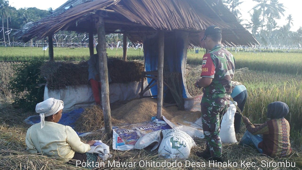 Salah satunya yang dilakukan Serda N. Simatupang di Desa Hinako adalah membantu petani untuk panen padi.
