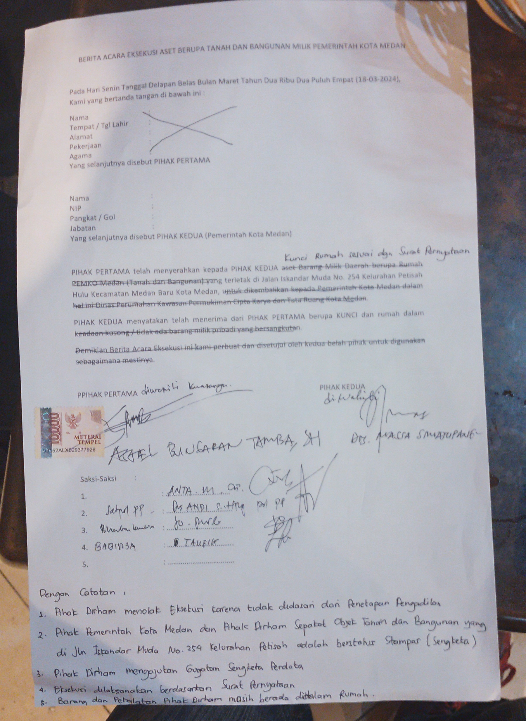 ” Eksekusi Untuk Mengosongkan Rumah Milik Pemerintah Kota Medan Jalan Iskandar Muda No 254/27 ” tulisnya pada 11 Maret lalu.