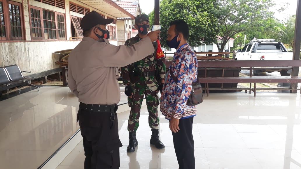Bripka Ibnu Budi U dan Pratu Jetro Sinaga melakukan upaya pencegahan dalam memutuskan wabah corona yang melanda saat ini dengan menympaikan imbauan wajib menggunakan masker dan melakukan pengecekan suhu tubuh kepada pegawai maupun masyarakat yang akan memasuki Kantor Kecamatan.