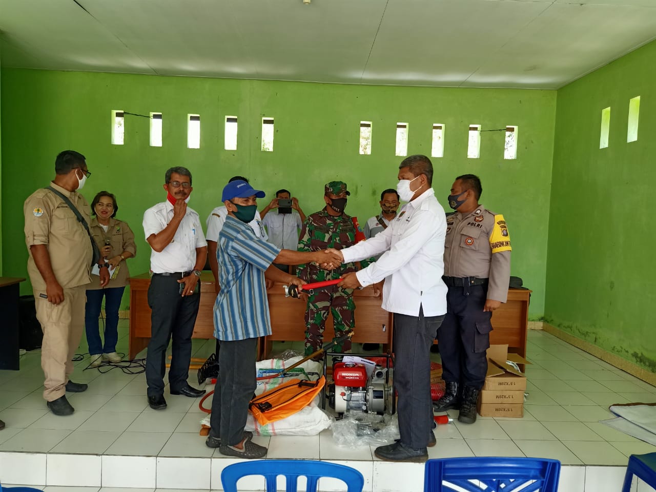 Adapun alat yang diberikan yaitu , Mesin 1 buah merk Honda, Nosel 2 buah, Selang 6 buah, Pompa punggung 3 buah, Gepyok 3 buah, Garpu tanah 3 buah, Kapak 2 fungsi 3 buah, Helm dan Masker.