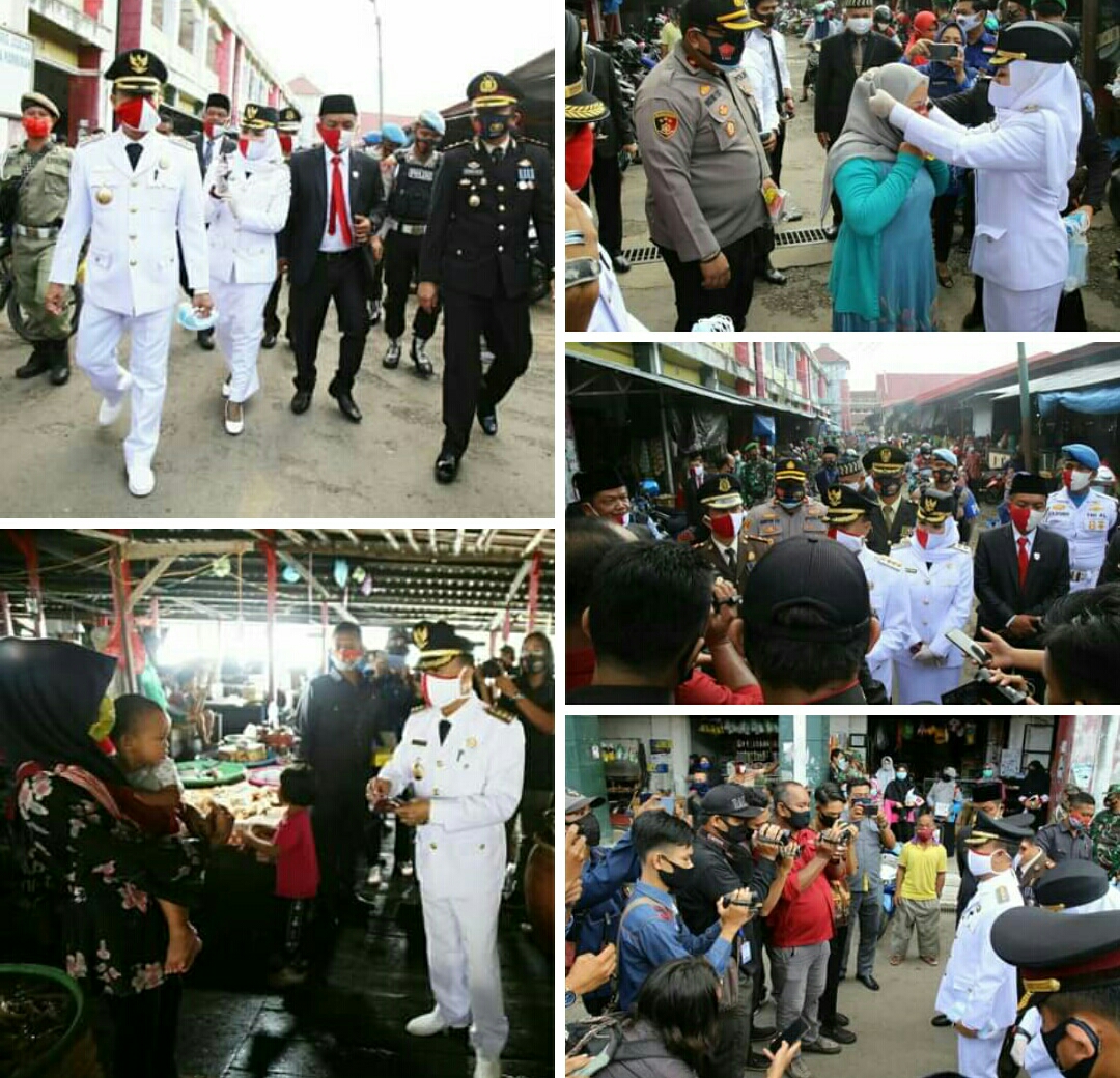Seruyan, lintas10.com-Selepas Upacara Pengibaran Sang Merah Putih, Bupati Seruyan Yulhaidir, Wakil Bupati Seruyan Hj. Iswanti, S.E., M.M., Ketua DPRD Kabupaten Seruyan Zuli Eko Prasetyo bersama Unsur Forkopimda Kabupaten Seruyan beranjak menuju Pasar Sayur dan Ikan Kuala Pembuang untuk Membagikan Masker dan Vitamin C kepada para pedagang dan pengunjung pasar tersebut. Hal ini dilakukan dalam rangka memperingati HUT Ke-75 Kemerdekaan Republik Indonesia.
