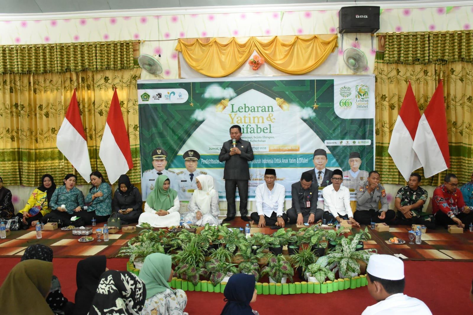 “Lebaran Yatim dan Difabel ini mengusung tema kesetaraan, sejuta harapan untuk meraih keberkahan. Jangan berkecil hati, anak-anak sekalian. Saya pun seorang anak yatim, berasal dari desa dan keluarga transmigran. Alhamdulillah, bisa menjadi Ketua DPRD Provinsi dan kini menjabat sebagai Bupati,” ujarnya memberi semangat kepada para peserta.