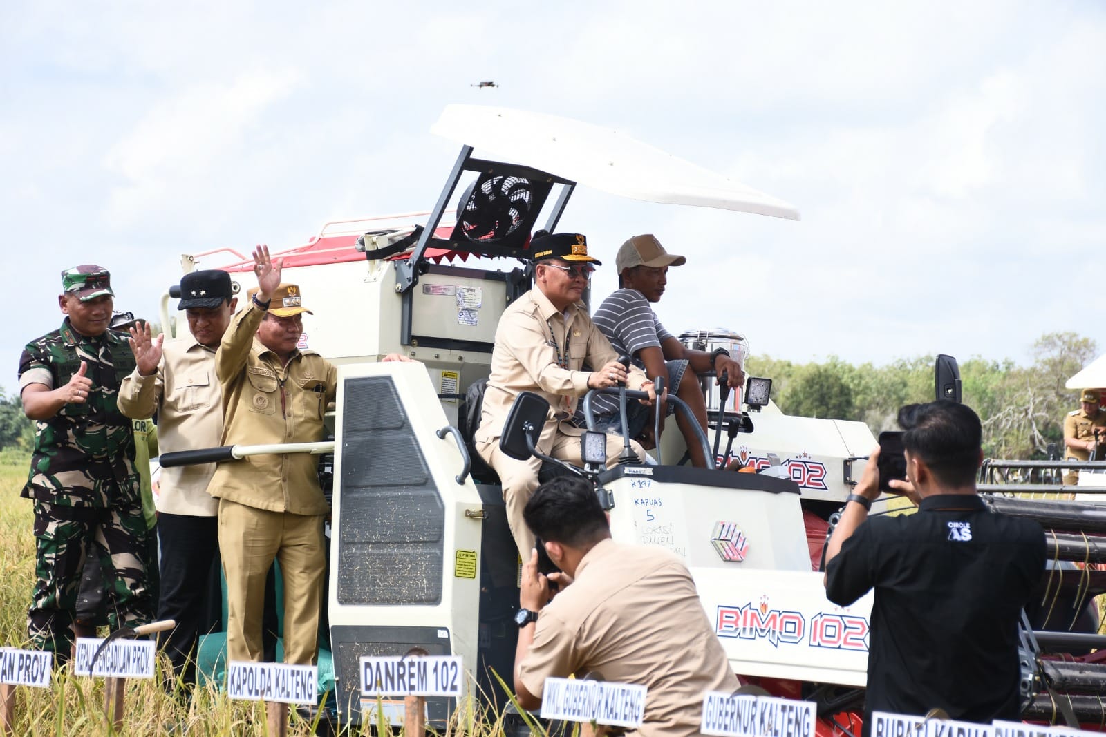 Gubernur Kalimantan Tengah H. Agustiar Sabran, Wakil Gubernur H. Edy Pratowo, dan Bupati Kapuas H.M. Wiyatno bersama-sama melaksanakan panen raya padi di kawasan sentra produksi pangan Desa Terusan Makmur, Kecamatan Bataguh, Kabupaten Kapuas, Senin (14/07/2027).