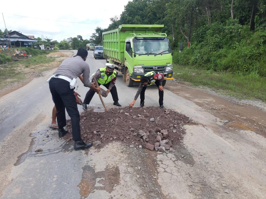 “Kami informasikan jalan yang mengalami kerusakan di jalan lintas trans kalimantan sebanyak 16 titik dan telah dilakukan penimbunan,” kata Kasat.