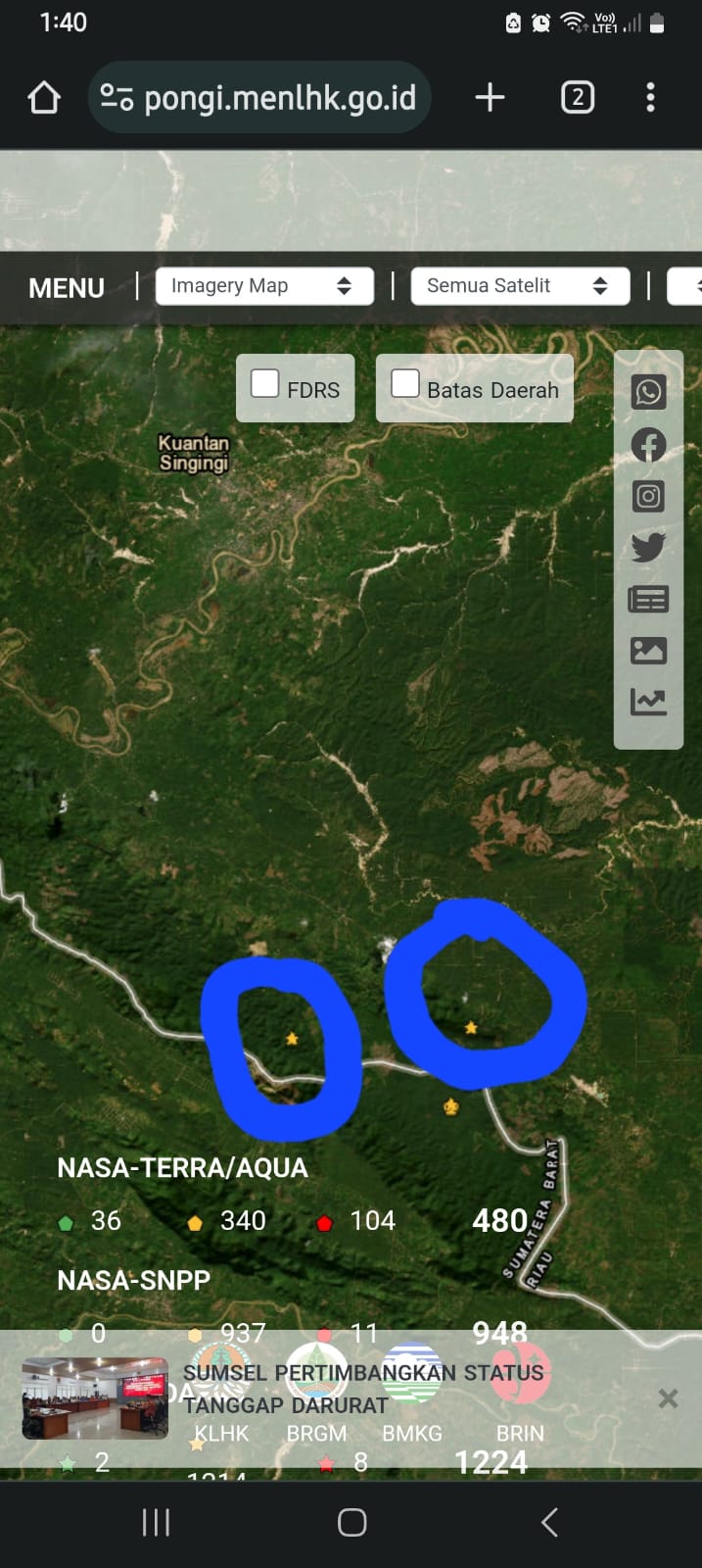 ” Ini berdasarkan hasil pemantauan dari satelit NASA NPP, dengan titik koordinat 340, berada di Desa Pantai dan Lubuk Ramo Kecamatan Kuantan Mudik,” katanya.