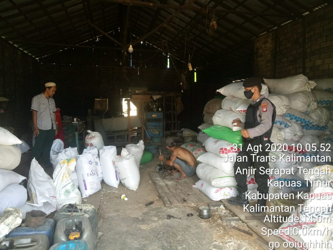 Kalimantan Tengah, lintas10.com- Anggota Polsek Kapuas Timur Polres Kapuas Polda Kalteng Aipda Taufiq dan Bripka Munawir melaksanakan pengecekan tempat penggilingan padi milik H.Dian Pemilik Gudang dan penggilingan Padi Warga Desa Anjir Serapat Tengah rt 11 Kec. Kapuas Timur Kab. Kapuas. Senin (31/08/2020) siang.