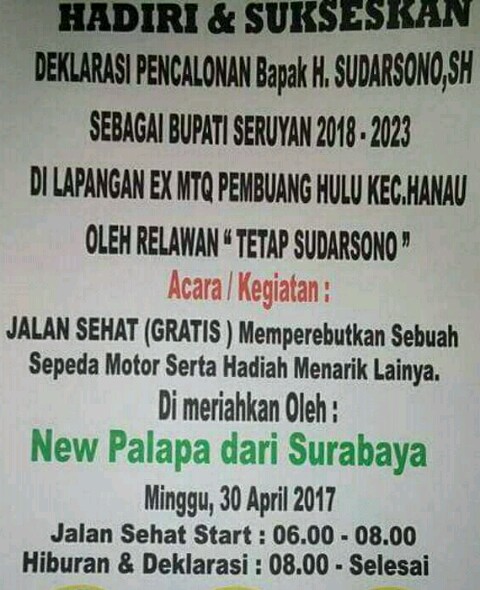 Lintas10.com (seruyan/kalteng) -Meskipun Pilkada Seruyan 2018 masih terbilang lama lagi, namun suasana persiapan jelang pagelaran 5 tahunan itu di Seruyan sudah mulai terasa. seperti yang akan berlangsung pada Minggu (30/4/2017) nanti, yang mana Sudarsono yang menjabat Ketua DPD Golkar Seruyan juga masih menjabat sebagai Bupati Kabupaten seruyan, akan melakukan deklarasi pencalonan dirinya kembali sebagai Bupati Seruyan periode 2018-2023. Deklarasi akan dilakukan oleh relawan yang mengatas namakan “tetap Sudarsono”.