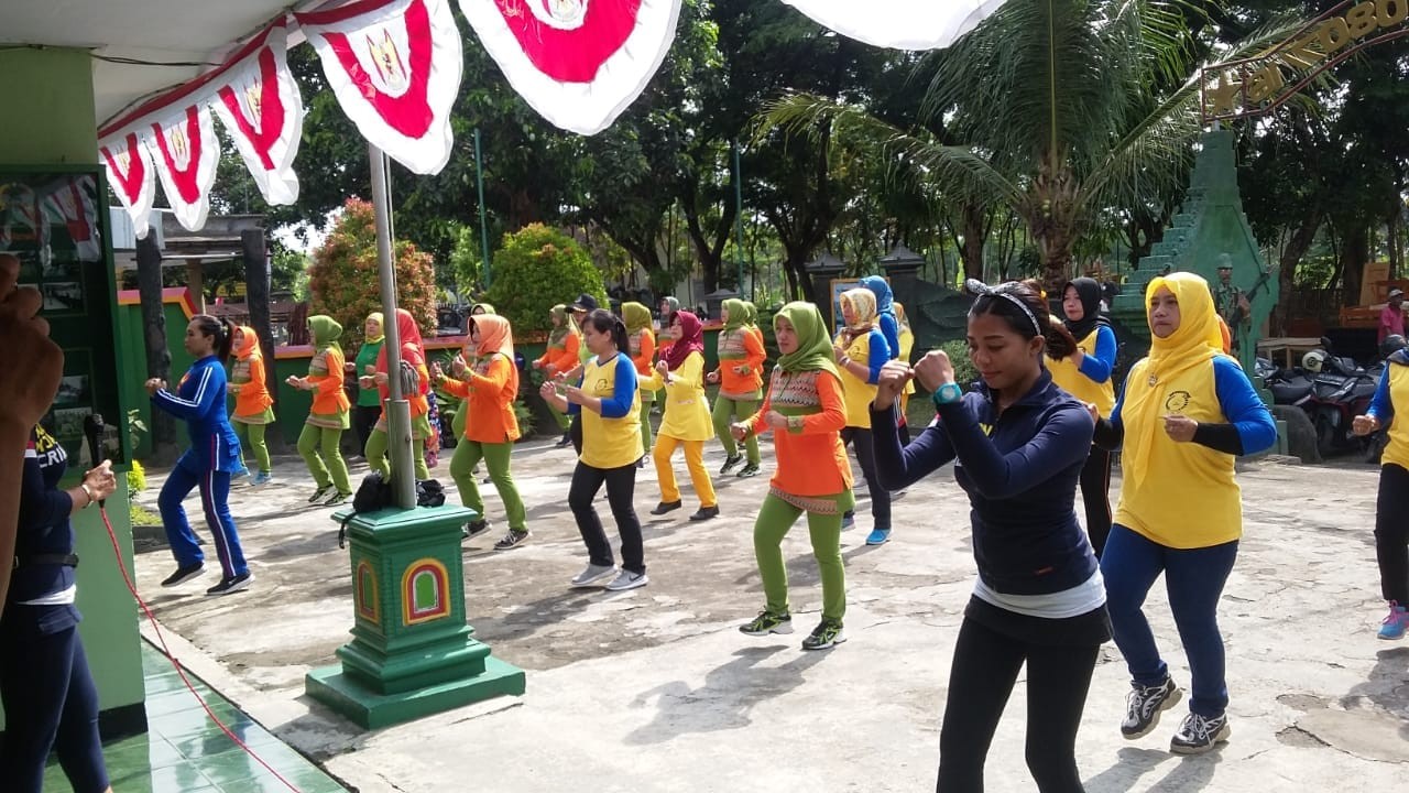 Kegiatan senam dipimpin instruktur senam dari Perwosi, Nina, selain para ibu-ibu mendapat dukungan juga dari para anggota TNI dan Polri tampak serius tapi santai mengikuti arah gerakan.