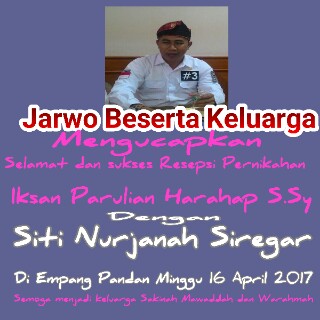 Jarwo Beserta Keluarga Mengucapkan Selamat Atas Resepsi Pernikahan Iksan dan Nurlintas1015 - April - 2017Politik233 kali dibaca Baca Juga: APBD Perubahan 2023 di Sahkan, ini Yang Jadi Perhatian DPRD Siak