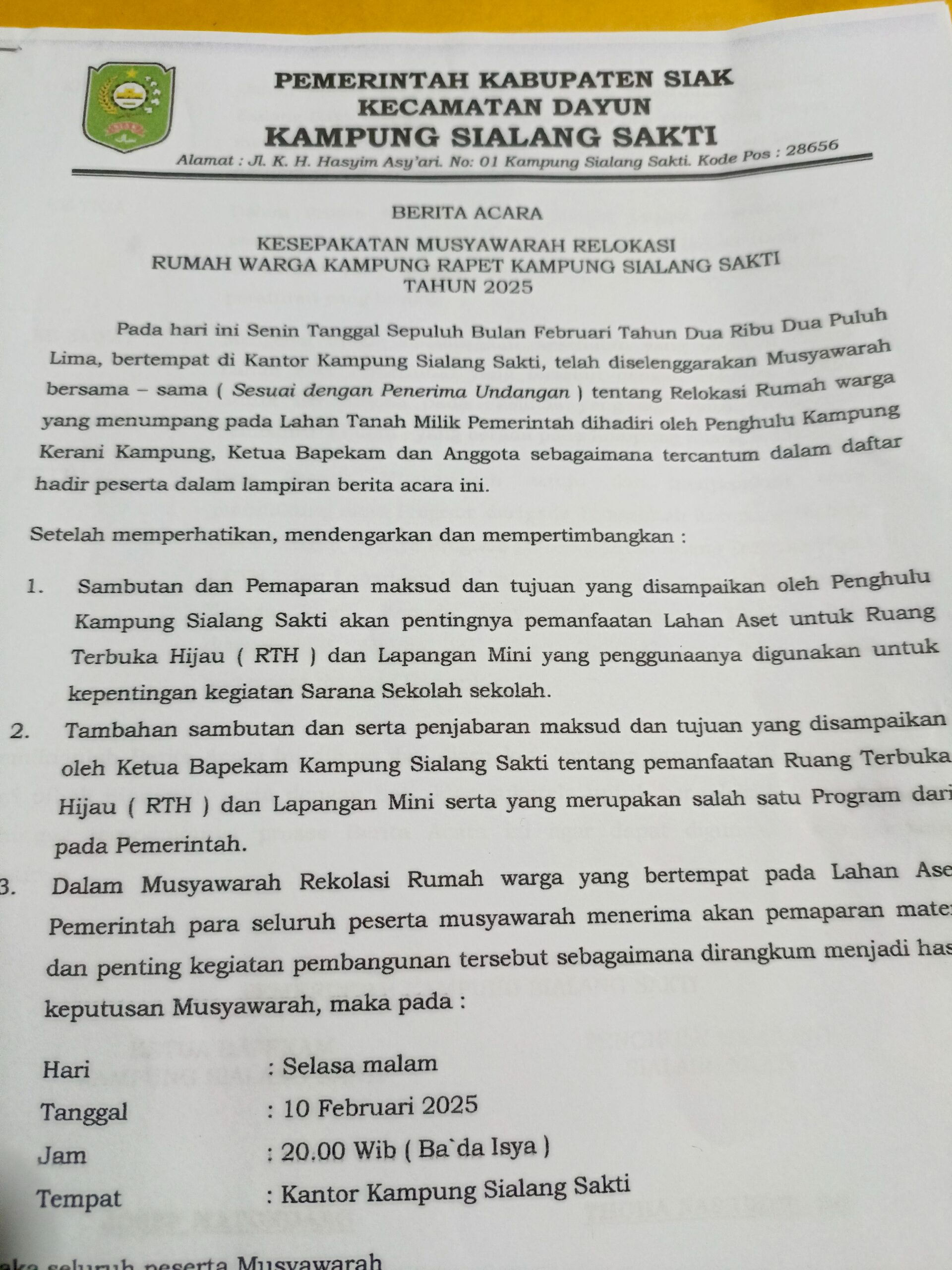 Siak, lintas10.com– Kampung Sialang Sakti akan membangun ruang terbuka hijau (RTH) dan lapangan mini yang pelaksanaannya di tahun 2025.