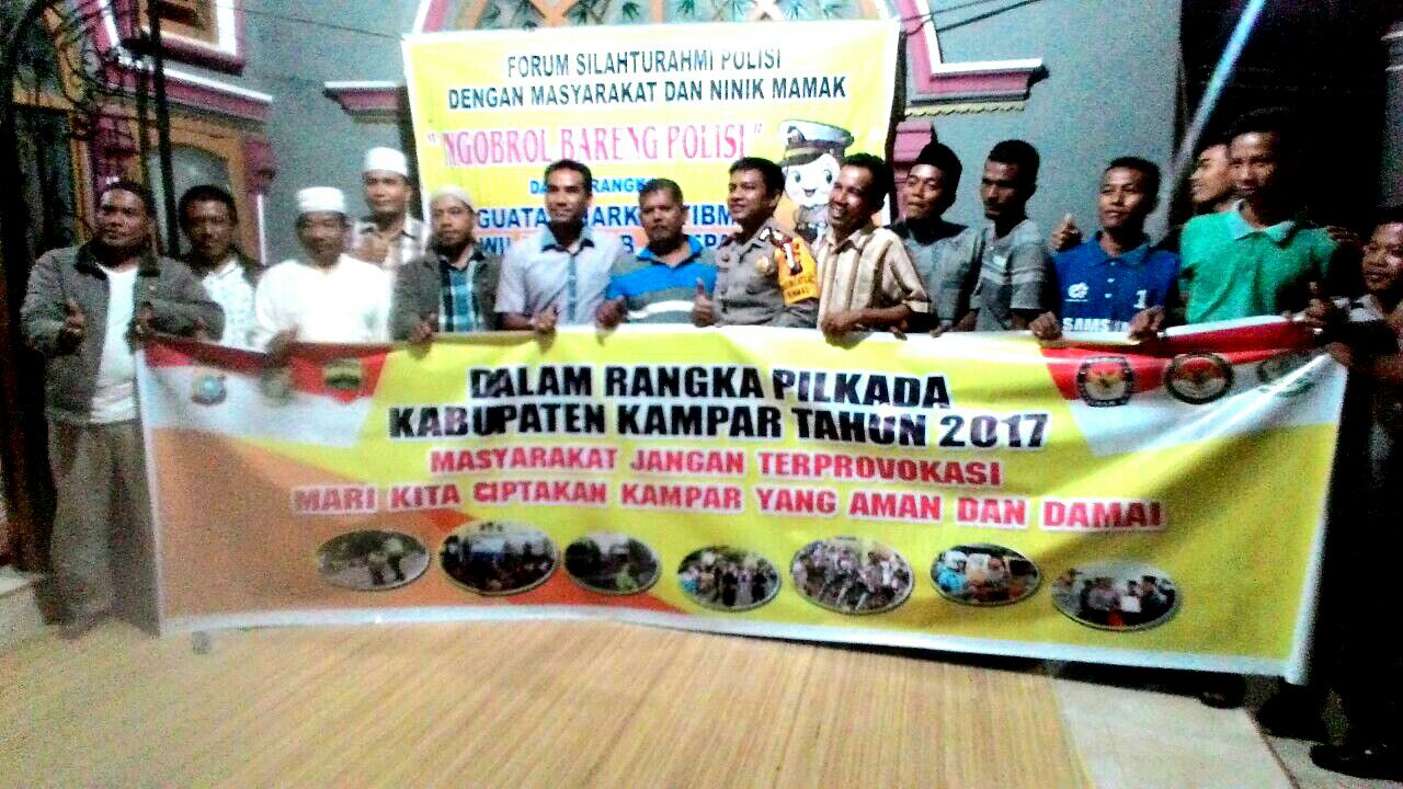 Lintas10.com, KAMPAR- Kapolres Kampar AKBP Edi Sumardi P SIK Senin (7/11/2016) bertempat di Desa Pulau Jambu Kecamatan Kuok Tepatnya di rumah Tokoh Adat Kholil Datuk Penghulu Besar dilaksanakan Forum Silaturahmi dengan Masyarakat dan Ninik mamak dalam bentuk kegiatan “Ngobrol Bareng Polisi” dalam rangka penguatan pemeliharaan Kamtibmas di Wilayah Kabupaten Kampar.