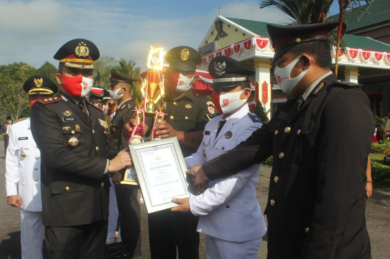 Kalimantan Tengah, lintas10.com– Kapolres Katingan AKBP Andri Siswan Ansyah., S.I.K., M.H., bersama Bupati Katingan, Sakariyas, S.E., dan unsur FKPD Kabupaten Katingan menyerahkan Piala, Piagam dan Uang Pembinaan kepada 3 Desa pemenang Lomba Lewu Isen Mulang usai penggelaran upacara peringatan Hari Kemerdekaan Republik Indonesia ke-75 tahun 2020 di Halaman Kantor Bupati Katingan, Senin, (17/8/2020).