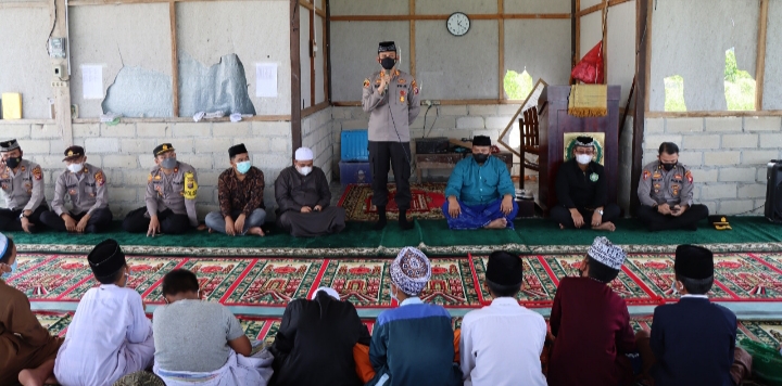 Kapolres Kotawaringin Barat AKBP Bayu Wicaksono memberikan edukasi prokes kepada santri di Ponpes Mambaul Hasan Lida’wah, Desa Sungai Tendang, Kec. Kumai, Kab. Kotawaringin Barat, Prop. Kalteng, Selasa (12/04/2022) siang.