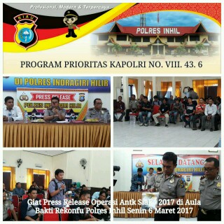Hal itu disampaikan orang nomor satu di Mapolres Inhil itu saat menggelar Press Release Senin (6/3/2017) di Aula Bakti Rekonfu Polres Inhil, Jalan Gajah Mada No. 2 Tembilahan.