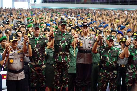 Hal tersebut dikatakan Panglima TNI Marsekal TNI Hadi Tjahjanto, S.I.P didampingi Kasad Jenderal TNI Mulyono dan Asops Kapolri Irjen Pol Drs. Deden Juhara mewakili Kapolri pada saat memberikan pengarahan kepada 3.452 personel TNI dan Polri se-wilayah Manado yang diawali dengan makan bersama prajurit di Aula Novotel, Manado, Sulawesi Utara, Kamis (12/4/2018) malam.