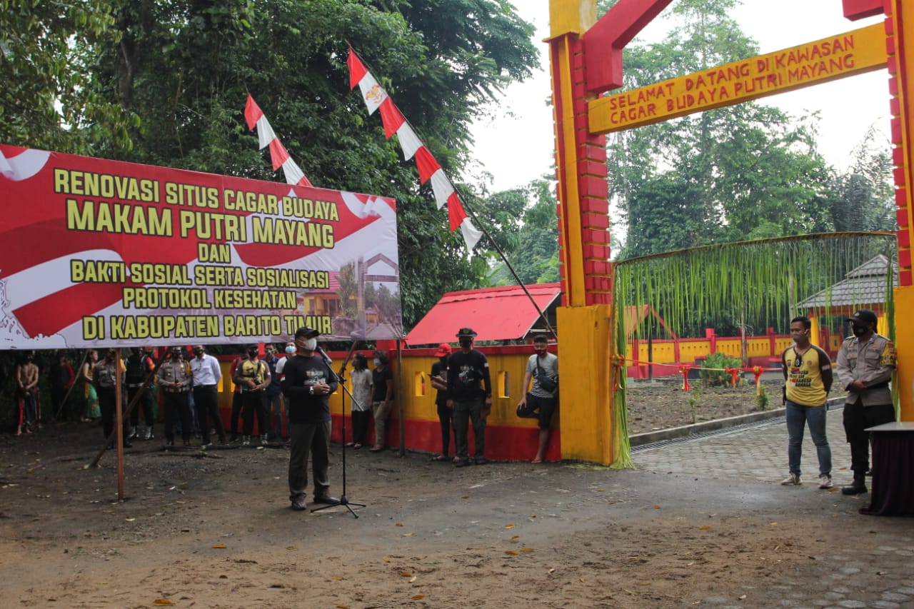 Kali ini, Kapolda Kalteng Irjen Pol. Dr. Dedi Prasetyo, M.Hum., M.Si., M.M. didampingi Kajati Prov. Kalteng Dr. Mukri, S.H., M.M., Danrem 102 Panju Panjung Brigjen TNI Purwo Sudaryanto, Kabinda Kalteng Brigjen Pol. Drs. Slamet Urip Widodo, Bupati Bartim, Irwasda Kombes Pol. Iman Prijantoro, dan pejabat utama Polda Kalteng meresmikan renovasi situs cagar budaya Makam Putri Mayang di Desa Jaar Kab. Barito Timur, Minggu (22/11/2020) Pagi.