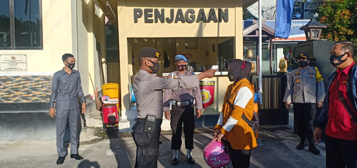 Adapun kegiatan tersebut berupa pengukuran suhu badan dengan menggunakan alat Thermo Gun yang dilakukan oleh Personil Piket Mako Satsabhara Polres Kotim dan Baur Dokkes Polres Kotim kemudian di lanjutkan dengan cuci tangan pada tempat cuci tangan bebas sentuh yang sudah di sediakan dan terletak di depan ruangan SPKT Polres Kotim sebelum memasuki Mapolres Kotim.