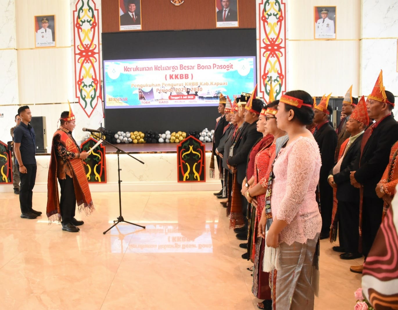 KUALA KAPUAS, lintas10.com– Bupati Kapuas HM Wiyatno secara resmi mengukuhkan Pengurus Kerukunan Keluarga Besar Bonapasogit (KKBB) Kabupaten Kapuas Periode 2025–2030, acara berlangsung khidmat dan penuh kekeluargaan, bertempat di Hall Rumah Jabatan Bupati Kapuas, Sabtu (5/7). Pahala Aritonang ditetapkan sebagai Ketua KKBB Kapuas yang baru dalam periode kepengurusan ini.