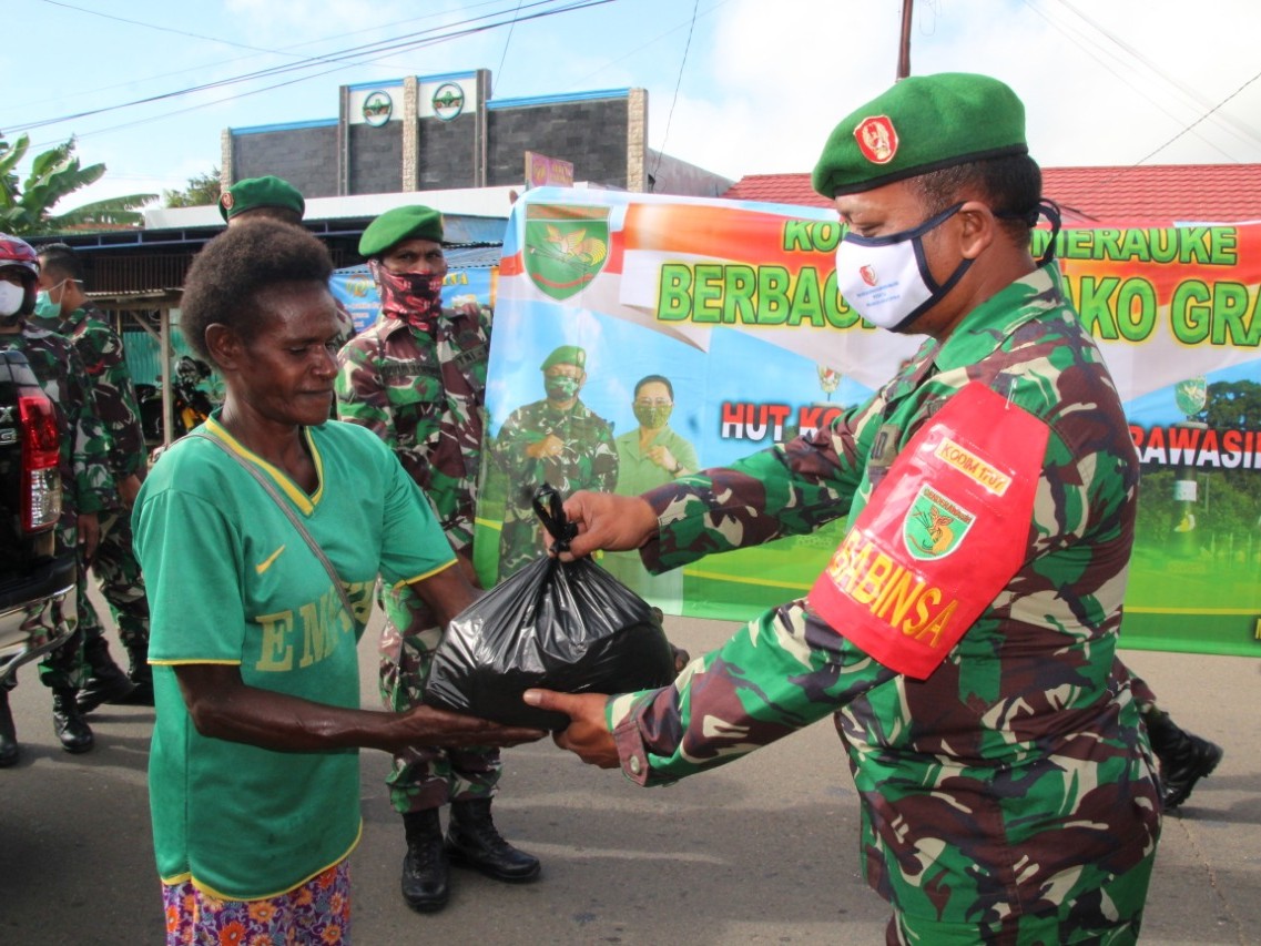 “Hari Ulang Tahun Kodam XVII/Cenderawasih kemarin pada tanggal 17 Mei 2020 dan saat ini di Merauke kita membagikan sedikitnya 150 paket sembako kepada masyarakat asli Papua yang sangat membutuhkan akibat pandemi Covid-19 diantaranya mama-mama yang berjualan sayur di Jalan Parako, penjual lumut di Jalan Blorep dan mama-mama yang berjualan di Pasar Mangga Kudamati,” jelasnya.