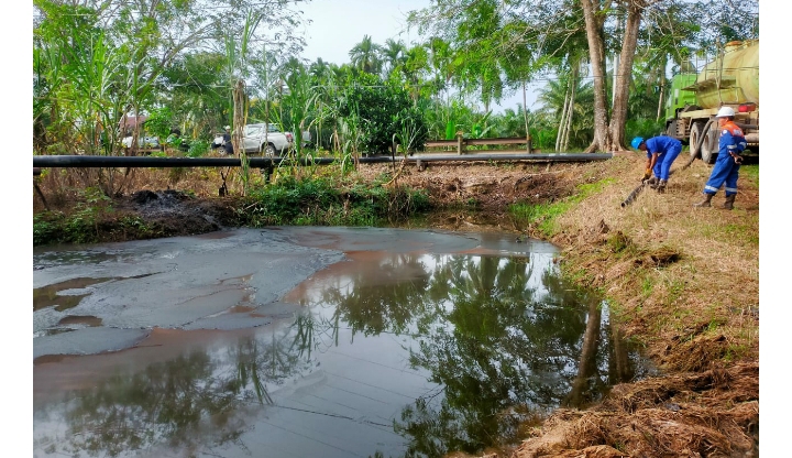Siak, lintas10.com–  Pipa milik PT. Bumi Siak Pusako (BSP) alami kebocoran di Kampung Sabak Permai Kecamatan Sabak Auh Kabupaten Siak, akibatnya minyak hitam pun berserakan hingga masuk ke dalam salah satu kolam di sekitar rumah Warga Kamis (27/1/2023).