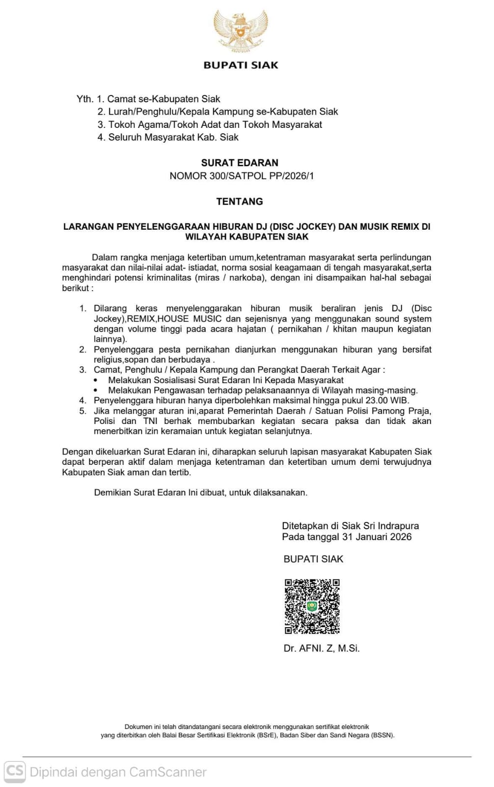 PJ menyampaikan surat edaran nomor 300/Satpol.PP /2026/1 yang lansung di tanda tangani Bupati Siak larangan Penyelenggaraan Hiburan DJ (Disc Jockey) dan musik Remix di wilayah Kabupaten Siak.