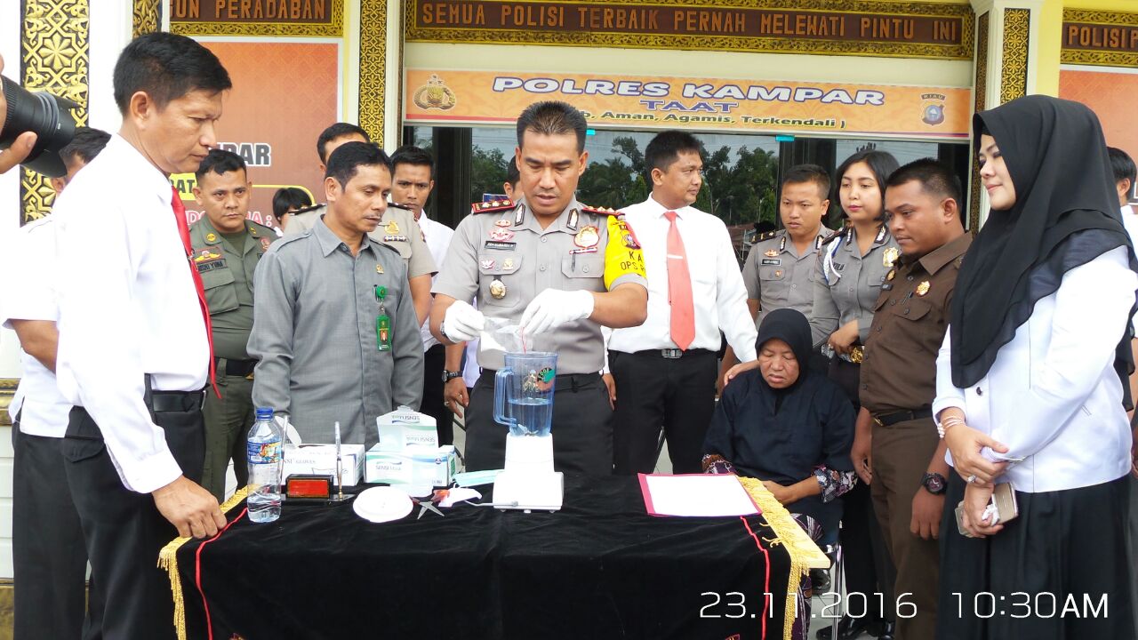 Pemusnahan barang bukti itu di gelar di Mapolres Kampar dipimpin langsung Kapoles Kampar AKBP Edi Sumardi P. SIK disaksikan perwakilan badan narkoba kabupaten, Kejaksaan negeri Kampar, Pengadilan negeri bangkinang, Dinas kesehatan, satpol PP serta media yang meliput selasa (23/11/2016).