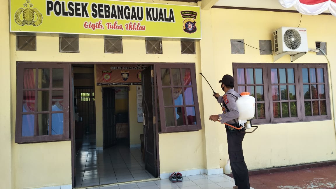 Kapolres Pulang Pisau AKBP Yuniar Ariefianto, S.H S.I.K, M.H. melalui Kapolsek Sebangau Kuala Ipda Bimo Setyawan, S.H. menuturkan, kegiatan penyemprotan cairan desinfektan di mako polsek bertujuan untuk memutus penyebaran virus covid-19.