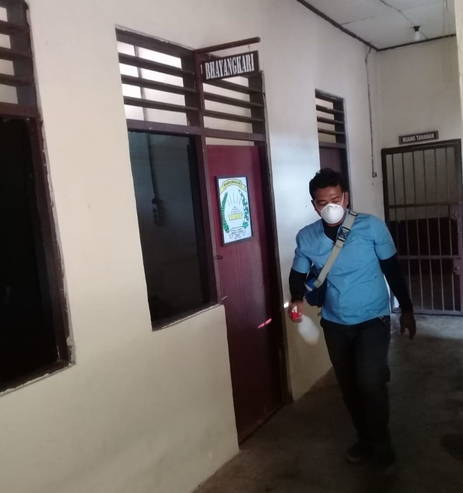 Sterilisasi dilakukan dengan penyemprotan cairan disinfektan ke seluruh sudut Mako, lantai, dinding, pintu hingga tempat tahanan.
