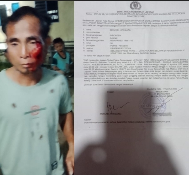 Lintas10.com, Mandailing Natal – Mencari Hati Giawa menjadi sasaran amuk segerombolan “preman kampung” di perumahan Divisi IV KBG PT.MAL, Desa Sikapas, Kecamatan Muara Batang Gadis, Kabupaten Mandailing Natal, Sumatera Utara, Jum’at (22/8/2025).