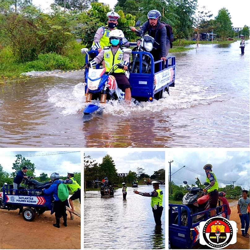 Salah satunya yang dilakukan oleh personel Satlantas Polres Kobar memberikan layanan angkutan gratis kepada pengendara yang akan melewati jalan Kotawaringin Lama – Pangkalan Bun tergenang banjir.