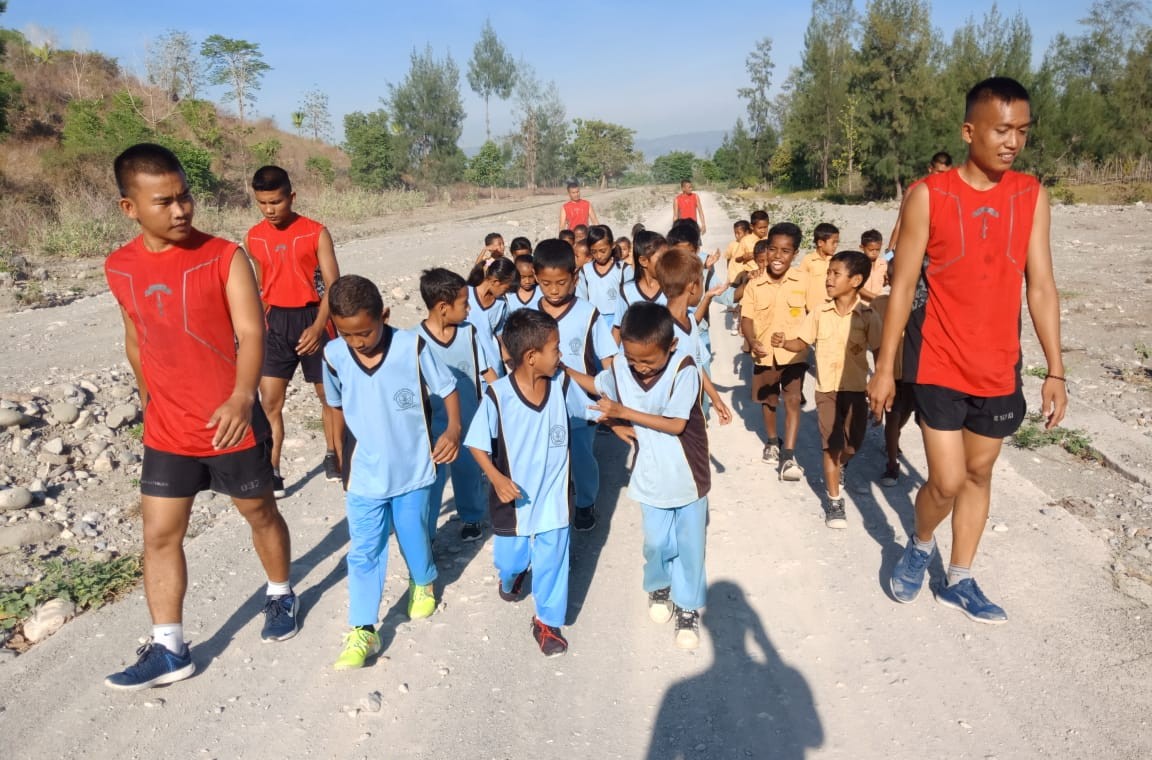 “Lari dengan jarak kurang lebih 1500 meter tersebut diikuti 41 orang anak SD Sianar Atubesi serta guru pendamping yang dikawal enam personel dari Pos Delomil,” ucap Ikhsan.