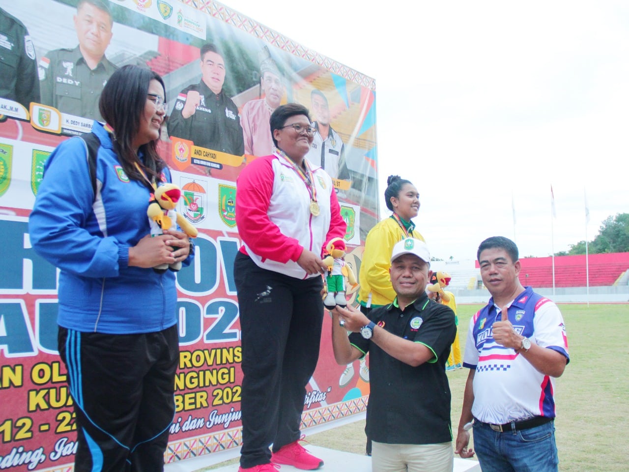Dalam penyerahan medali emas nomor Lempar Cakram dilakukan Ketua PASI Riau, Aherson, didampingi Ketua PASI Kuansing Indratno dan pelatih.
