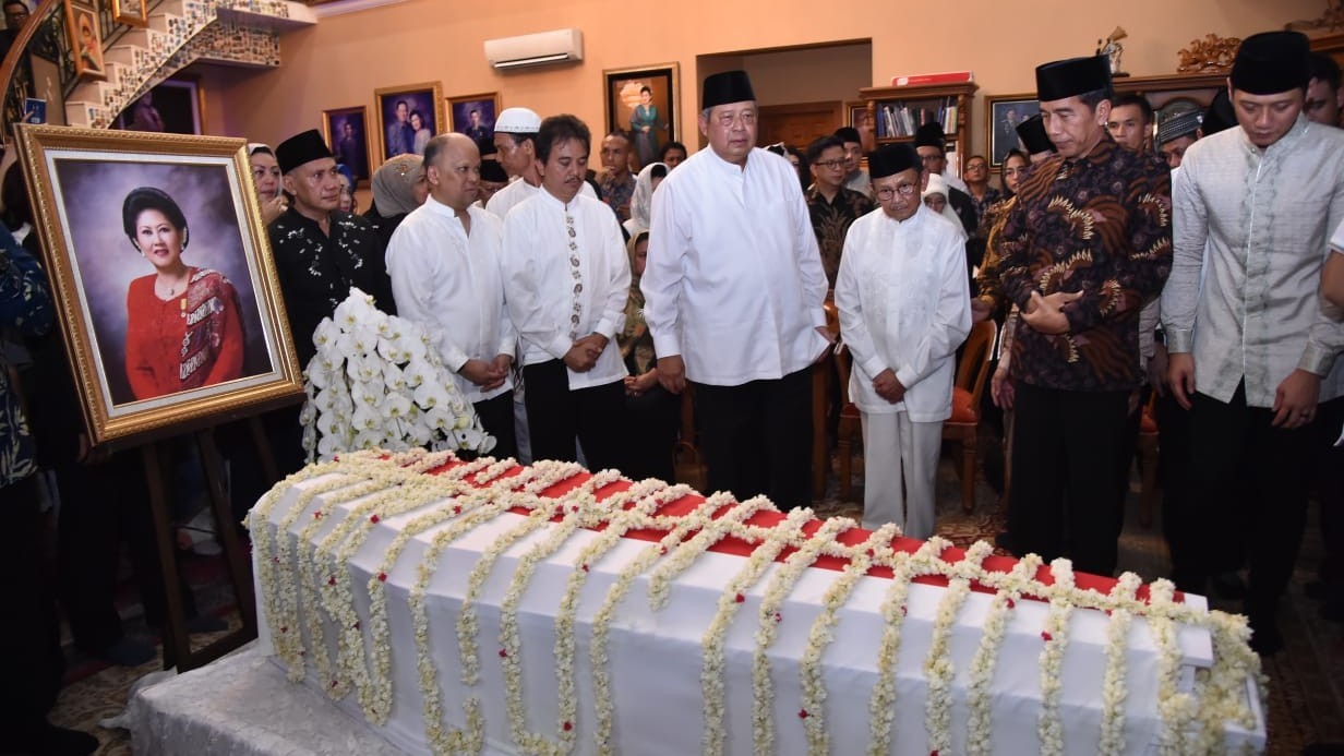 Setelah peti ditempatkan di dalam rumah, SBY kemudian memasuki rumah duka yang sudah dipenuhi para pelayat.