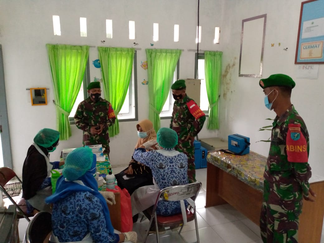Danramil 1014 – 08/Jelai Letda Inf Supriono yang langsung terjun kepalapangan bersama anggotanya melakukan monitoring sekaligus Pengamanan dalam rangka antisipasi adanya gangguan kamtibmas serta memberikan motivasi dan semangat kepada calon penerima vaksin supaya tidak ragu dan tidak takut disuntik Vaksin, selain itu juga dalam rangka memberikan kenyamanan terhadap para tenaga medis maupun para peserta Suntik Vaksin Sinovac Covid 19.