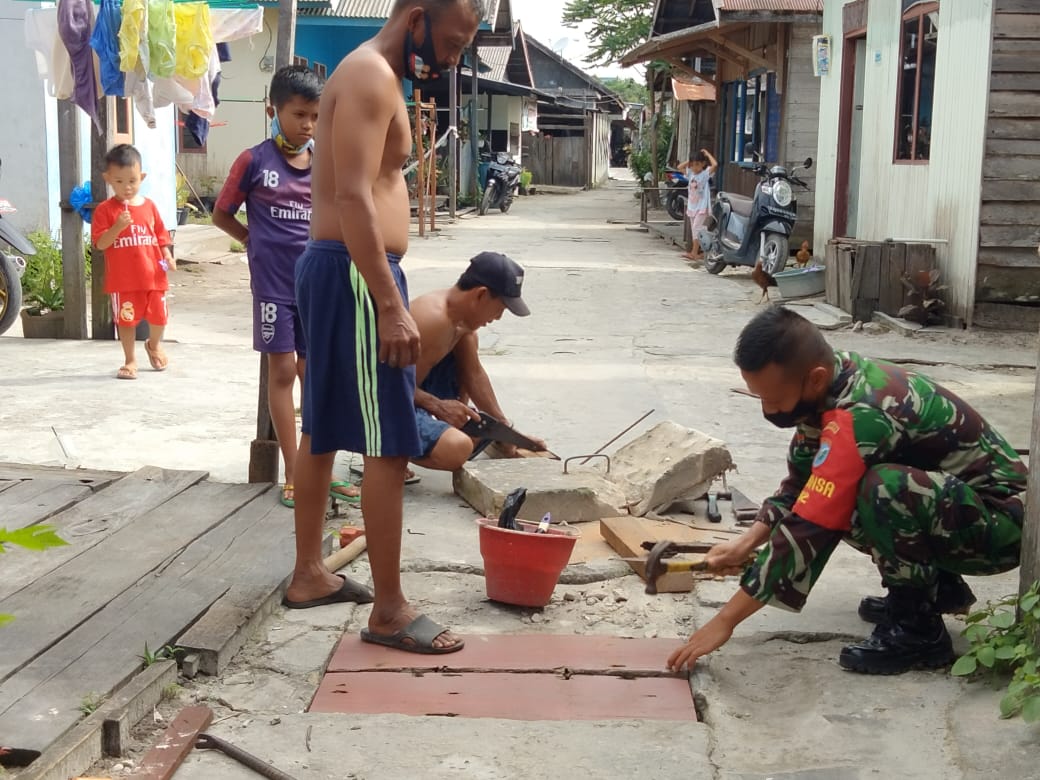 Wujud Kemanunggalan TNI dengan Rakyat, Babinsa Kumai Hilir Bantu Warga Buat Penutup Saluran Air
