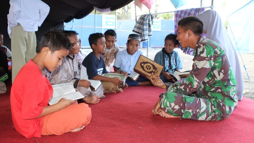 Palu, Lintas10.com – Batalyon Arhanud 16/SBC Divif 3 Kostrad yang tergabung dalam Satgas Penanggulangan Bencana Alam Divif 3/Kostrad membuka Taman Pendidikan Al-Qur’an (TPA) di camp pengungsian Kelurahan Kayu Malue Kecamatan Palu Utara, Kota Palu, Jumat (19/10/2018).